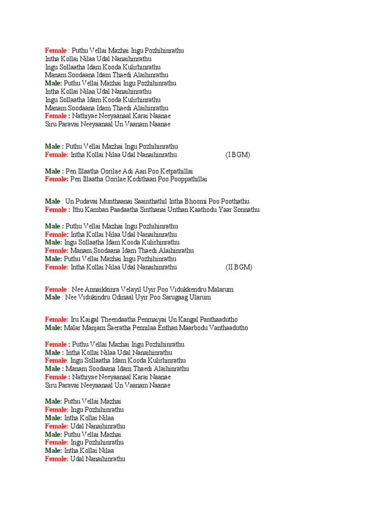Pudhu Vellai Mazhai Lyrics - Sujatha, unni menon] pudhu vellai mazhai, ingu pozhigindradhu indha kollai nilaa, udal nanaigindradhu ingu sollaadha idam kooda kulirgindradhu manam soodaana idam thedi alaigindradhu. Pudhu Vellai Mazhai Lyrics : Sujatha & unni menon lyrics :